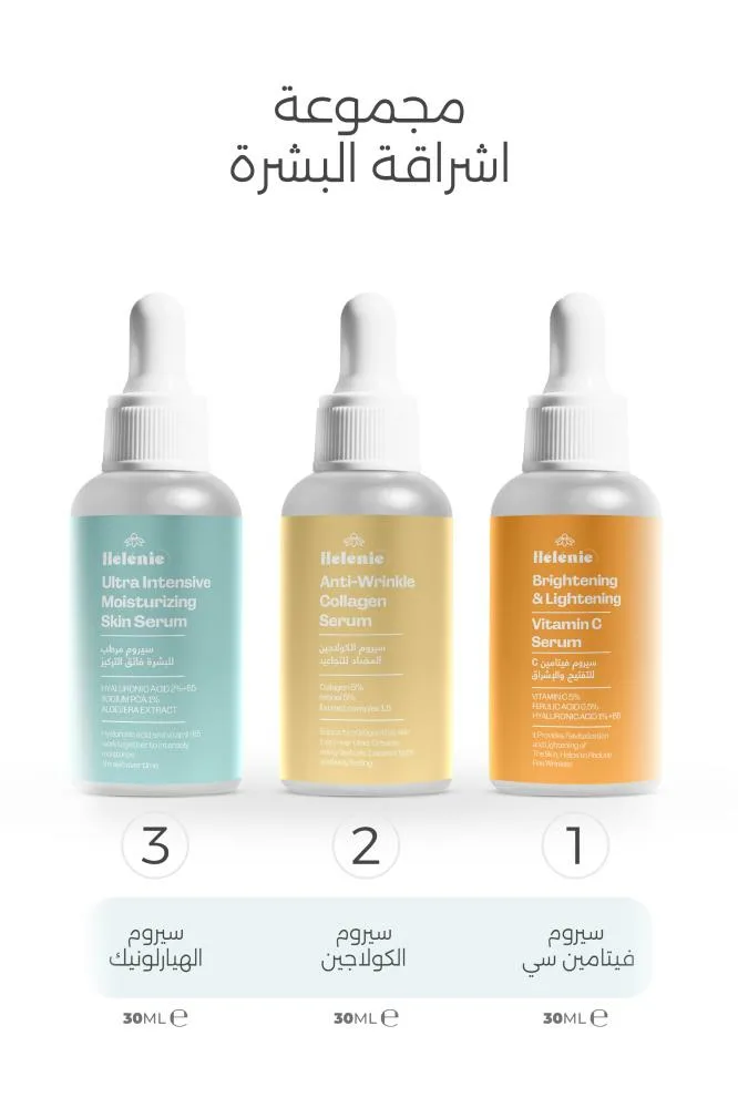 • روتين متكامل للعناية بالبشرة: سيروم فيتامين سي، سيروم الكولاجين، وسيروم الهيالورونيك لتلبية جميع احتياجات البشرة.